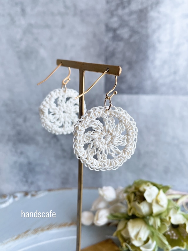 軽やかで華やかなアクセント! 『ホワイトコインのピアス』のキットです。 価格 1,100円(税込) このピアスは、かぎ針編みで丁寧に作られた美しいホワイトモチーフのデザインが特徴です。軽い素材を使用しているため、長時間の着用でも快適さを保ちます。 シンプルながらも存在感のあるこのピアスは、どんなスタイルにも合わせやすく、カジュアルからフォーマルまで幅広いシーンで活躍します。 こちらの商品は 個別のピアスとして、またギフトにも喜ばれるアイテムです。 ご不明な点がございましたら、お気軽にお問い合わせください。 ●商品情報 制作レベル ★★☆☆☆(中級) 技法 かぎ針編み サイズ 約2cm(花部分) ✼••┈┈┈┈••✼••┈┈┈┈••✼ HandsCafe は シンプルシックなデザインの中にも 手仕事の温かみや 繊細さが感じられる 大人の女性にぴったりの 上質感のあるアイテムを提案している 編み物教室です ✼••┈┈┈┈••✼••┈┈┈┈••✼
